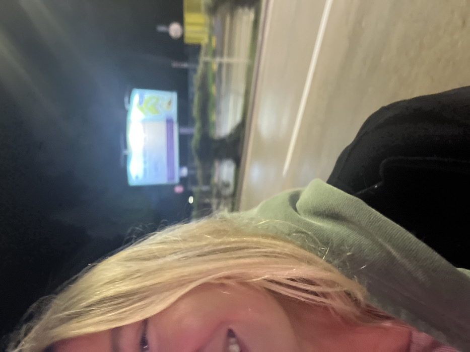 A selfie-style photo shows a person with blonde hair wearing a light green hoodie and a black jacket. The background is a night scene with a large illuminated sign or billboard visible in the distance. A street or sidewalk is present in the background. The image appears to be taken at night, with a dark sky and artificial lighting illuminating the sign and surrounding area. The person's face is only partially visible.