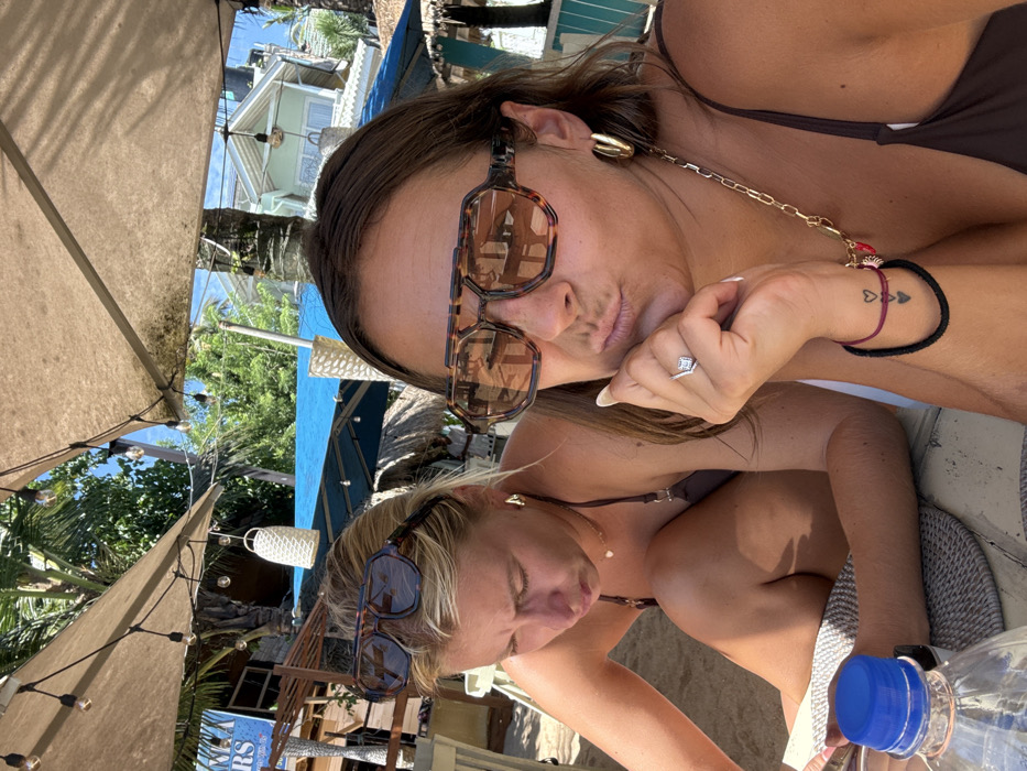 Two women, one with brown hair and sunglasses perched atop her head, pose closely together. She rests her chin on her hand, displaying a ring. Her wrist features multiple bracelets and a small tattoo. The second woman, blonde, wears sunglasses on her face. Both wear brown swimwear. A water bottle is visible in the foreground. They appear to be outdoors, possibly at a beachside location with umbrellas and vegetation in the background.