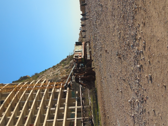 The image portrays an abandoned or unfinished construction site in Perazića Do, Montenegro, under a clear, cloudless blue sky. The foreground and midground consist of light brown, gravelly terrain interspersed with numerous small rocks and pebbles. In the midground, a substantial yellow tower crane structure, appearing partially disassembled or collapsed, stands near a large, rusted, orange and green tracked excavator. The excavator's oversized digging bucket lies detached on the ground adjacent to it. Further to the right, several rectangular, multi-colored structures resembling shipping containers or temporary offices are visible. In the background, a massive, multi-story concrete building with numerous open balcony levels rises. This unfinished structure features visible graffiti on its lower sections and is positioned directly against a steep, rocky cliff face adorned with sparse vegetation. Approximately 7 to 10 individuals are discernibly walking from left to right across the rocky ground in the far midground. A faint contrail is visible in the upper right quadrant of the sky.
