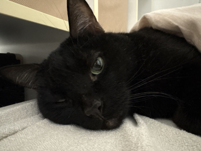 - "A black cat rests its head on a white, textured surface, possibly a towel or blanket" by FM-fLERp2, licensed under CC BY 4.0