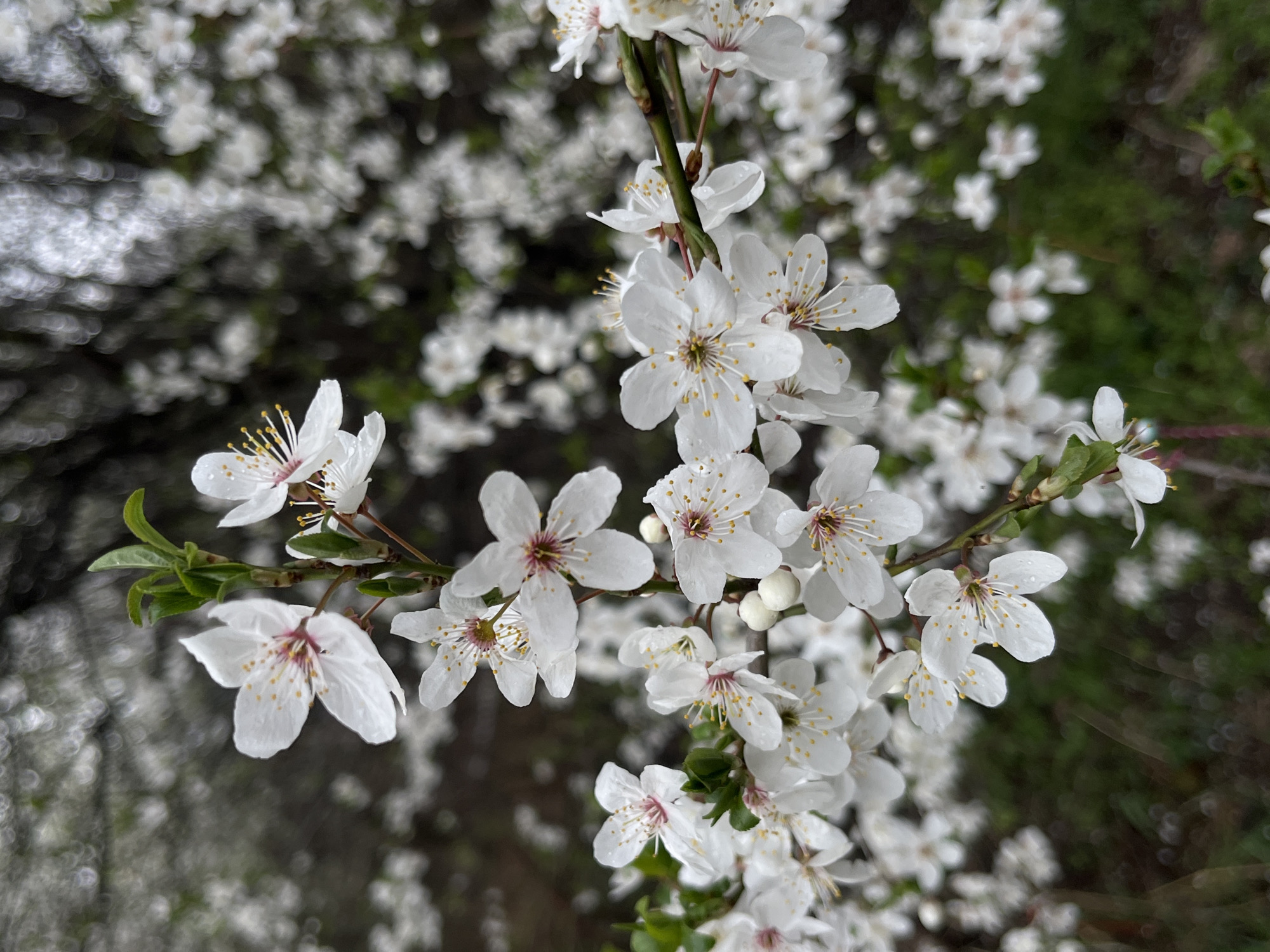 - "close-up of a blossoming tree branch with white flowers" by FM-XFy8W2, licensed under CC BY 4.0