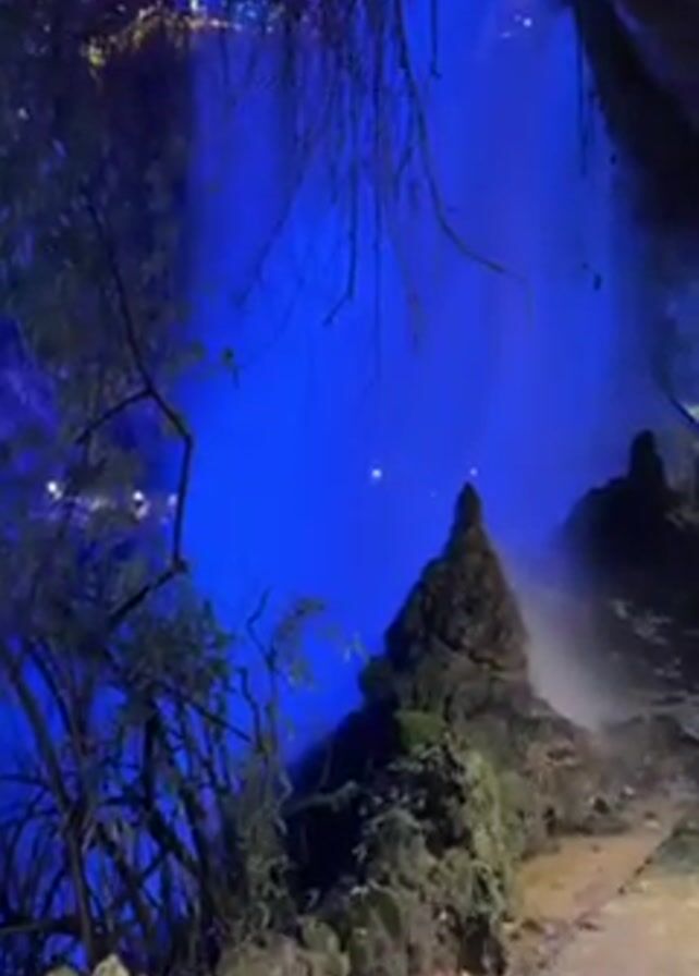 The video depicts a waterfall illuminated with blue light at night. The waterfall cascades down onto rocks covered in moss. The area is lined with trees and vegetation. A pathway with stairs is visible on the right side of the screen. Two people appear on the stairs, one with their arms outstretched. The background is dark with blurred lights. The sound of the waterfall can be heard.