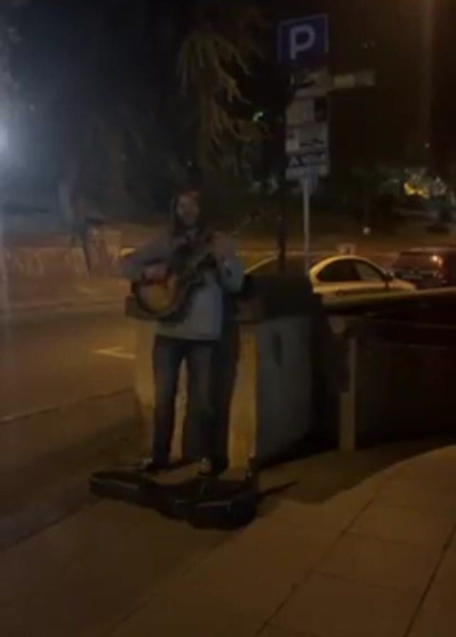 A man with long hair and a beard stands on a sidewalk at night playing an acoustic guitar. He is wearing jeans and a light blue jacket. His guitar case lies open on the sidewalk next to him. Behind him is a concrete barrier, a street, and a parking sign. Cars are parked on the street. The scene is lit by streetlights.