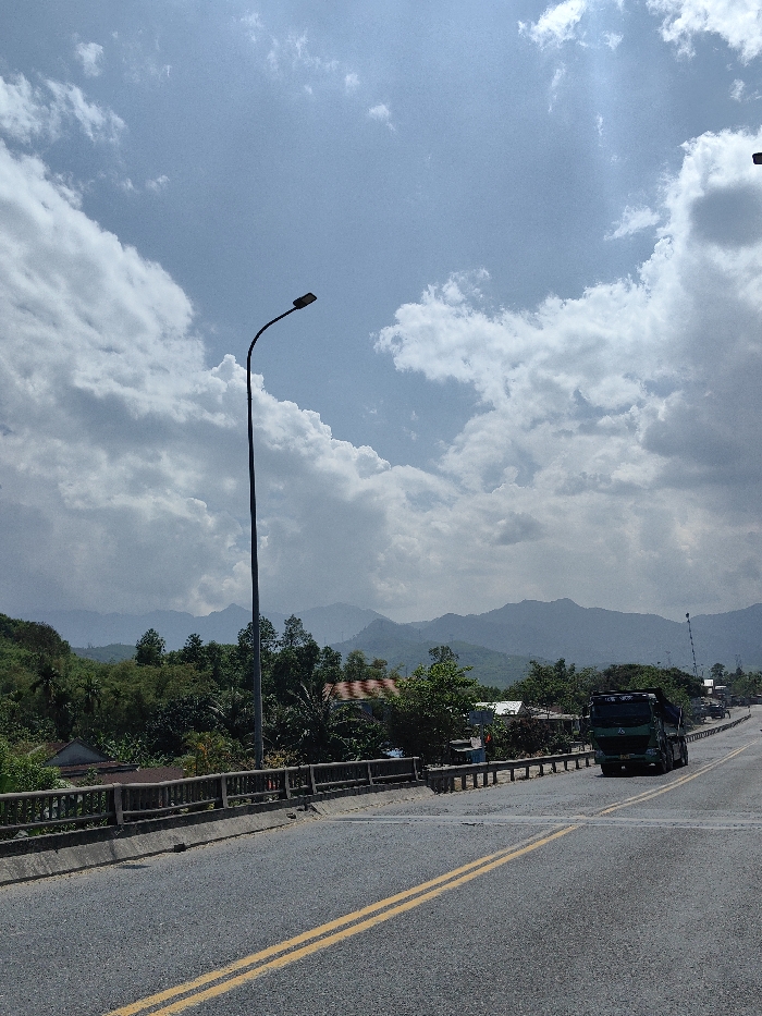 An outdoor daytime scene depicts a two-lane asphalt highway, marked with double solid yellow lines, curving gently to the right. A concrete bridge railing forms the left boundary of the road. A tall, dark grey streetlamp with a curved arm and a rectangular LED luminaire stands prominently in the left-center foreground. Beyond the bridge railing, dense green tropical vegetation, including trees and shrubs, covers the terrain, interspersed with several partially visible structures featuring corrugated metal roofs. In the mid-distance on the highway, a dark green heavy-duty truck, likely a dump truck, is observed traveling away from the viewer. Additional vehicles are faintly visible further down the road. The background is dominated by a range of forested mountains extending across the horizon under a bright blue sky partially covered by large white cumulus clouds. No individuals are visible. The scene's environmental characteristics are consistent with a rural or semi-rural highway area surrounding Huế, Vietnam; however, no specific landmarks permit precise location identification within the city.
