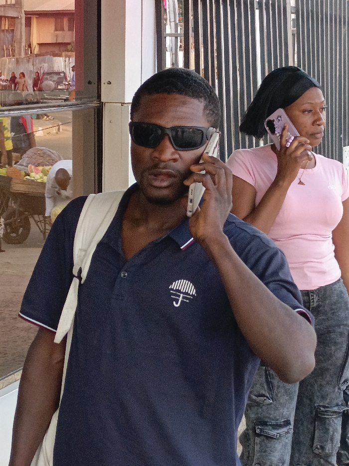 A man with sunglasses wears a navy blue polo shirt with an umbrella logo and a white strap over his shoulder, talking on a white smartphone. Behind him, a woman in a pink t-shirt and dark headscarf is also on a smartphone. They are standing in front of a building with reflective glass panels. In the reflection, a fruit vendor stands near a cart, and people can be seen in the background.
