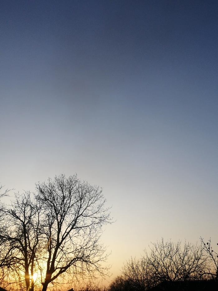 A photographic record of a natural environment in Galabovo, Bulgaria, captured during either sunrise or sunset. The sky, occupying the upper two-thirds of the frame, exhibits a gradient from dark blue overhead, transitioning through lighter blue to a bright orange-yellow at the horizon line. The sun is positioned low on the left side, partially obscured by the intricate, leafless branches of a large deciduous tree, producing significant lens flare and a prominent glow. A continuous silhouette of various bare-branched trees and low vegetation extends across the lower third of the image, obscuring the ground plane. No human subjects, identifiable architecture, or explicit activity are present within the frame.