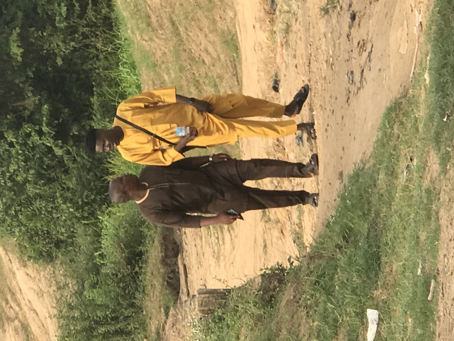 Two men in traditional attire walk along a sandy path. The man in front wears a bright yellow outfit with a black crossbody bag, and holds a water bottle. Behind him, the second man is dressed in a brown outfit and carries a phone. Both wear sandals. Lush green vegetation lines the path on the left and right. The background suggests a rural or semi-rural setting.