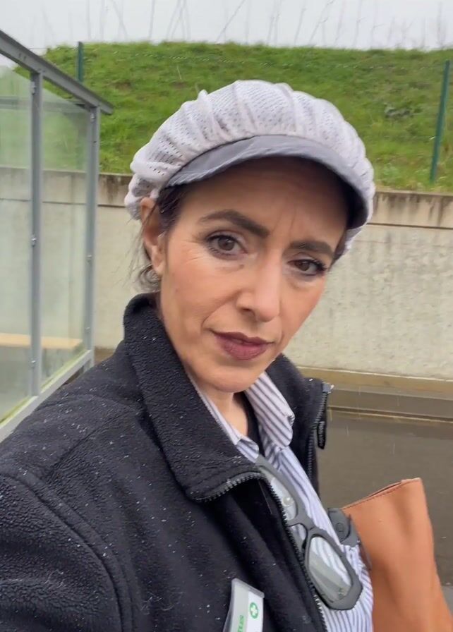 A woman is standing outside in overcast weather. She is wearing a gray cap, a black jacket, and a blue and white striped shirt. She also has sunglasses hanging on her shirt and is carrying a brown purse. She has a name tag that says “Cactus Ana A. Hotele.” She looks at the camera. There is a bus stop behind her, a concrete wall, and a grassy hill. It may be snowing.