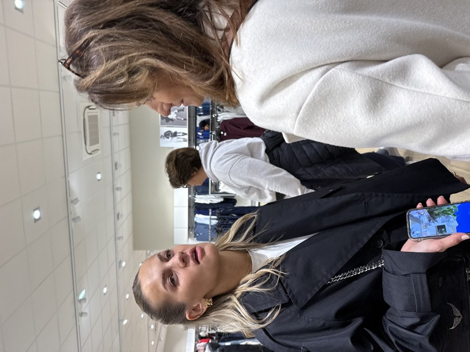 The scene depicts an interior view of a retail clothing store in Saint-Jean-Bonnefonds, France. Two women occupy the foreground, engaged in an interaction. The woman on the left, a young adult with blonde hair styled in a half-up ponytail, wears a black trench coat over a white top. She has a small gold-toned earring in her visible left ear and a thin gold-toned choker necklace. Her mouth is slightly open, and she looks towards the right. She holds a smartphone displaying a digital interface with blue and green elements in her left hand, and a black shoulder bag with a silver-toned winged embellishment and chain strap is visible on her left side. The woman on the right, an adult with brown hair featuring tortoiseshell-framed sunglasses resting on top, is partially visible from the chest up in profile, facing left. She wears a cream-colored, textured jacket. In the mid-ground, a third adult woman with short brown hair and glasses stands with her back partially to the viewer, wearing a light gray hooded sweatshirt and a dark, possibly quilted, lower garment, appearing to browse clothing racks. The environment features white walls and a white grid ceiling fitted with numerous recessed circular lights and track lighting fixtures. Clothing racks displaying denim, dark-colored, and lighter garments are visible in the background, alongside white shelving units. Two framed black and white fashion illustrations are mounted on a back wall. A white rectangular HVAC vent is present on the ceiling. The specific retail establishment name or precise address within Saint-Jean-Bonnefonds is not discernible.