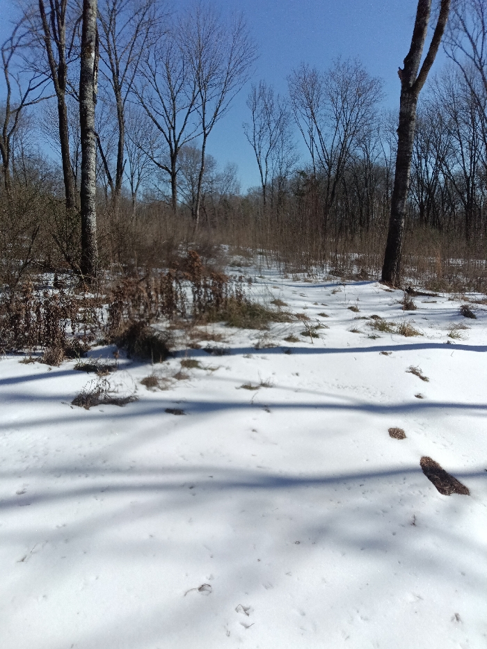 A winter scene shows a snow-covered forest floor with bare trees reaching towards a clear blue sky. Patches of dry vegetation and shrubs peek through the snow, with shadows stretching across the landscape. Animal tracks are visible in the foreground, suggesting recent activity. The overall impression is a quiet, sunny day in a sparse woodland setting.