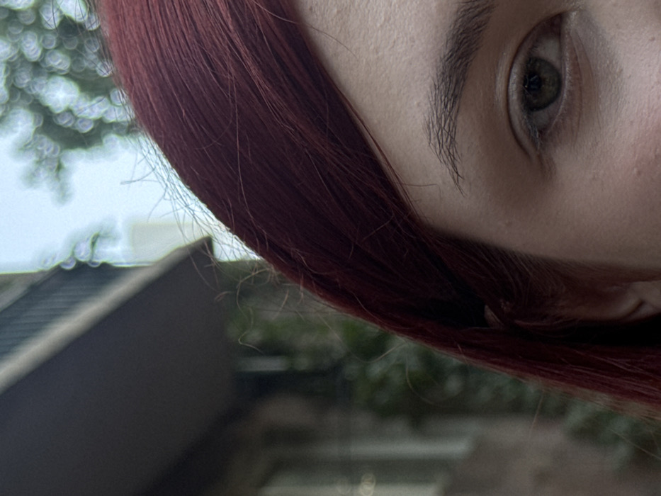 The image displays a close-up, partial view of an individual's face, specifically focusing on the right eye with a green iris, the eyebrow, and a section of the forehead and cheek. Dark red hair frames the right side of the face. The skin exhibits natural texture. The background is heavily blurred, revealing an urban environment during daylight. To the upper left, an older architectural structure is visible, featuring a dark-colored balcony with railings. Beyond this structure and to the upper right, blurred green foliage from trees is apparent against a bright sky, displaying distinct circular bokeh. The environment indicates an outdoor setting within a city. The precise location within Yerevan, Armenia, cannot be determined solely from the visual information provided.