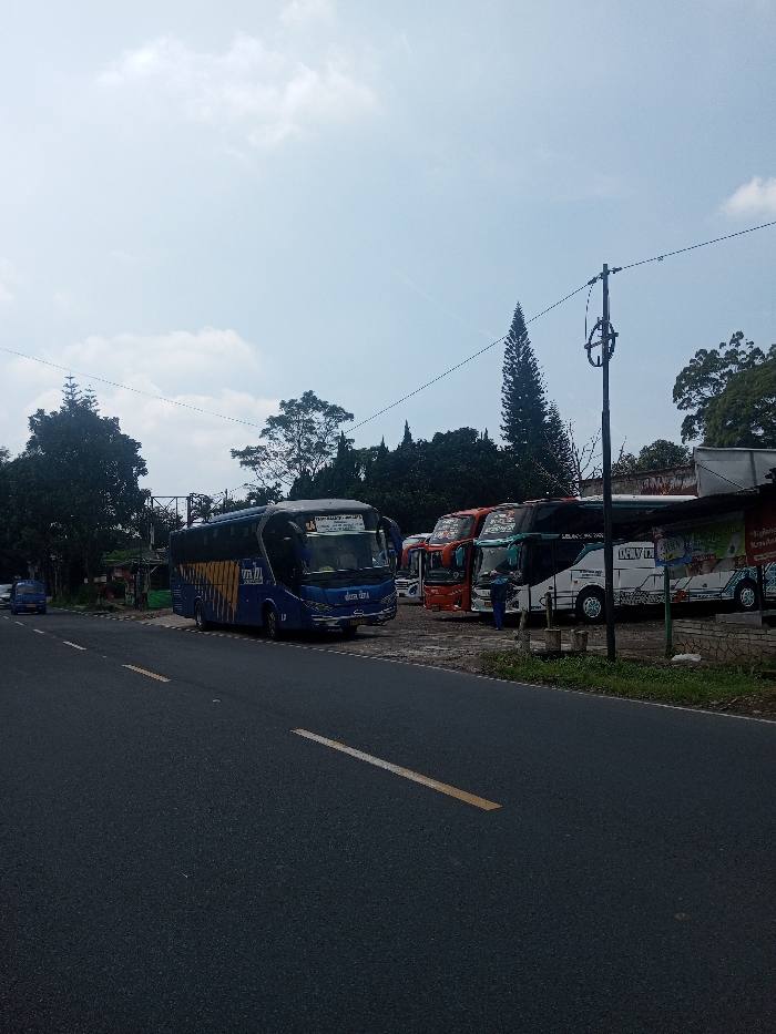 This image depicts an outdoor scene in the city of Niz Lakuk, India, featuring a roadside bus parking area under a partly cloudy sky