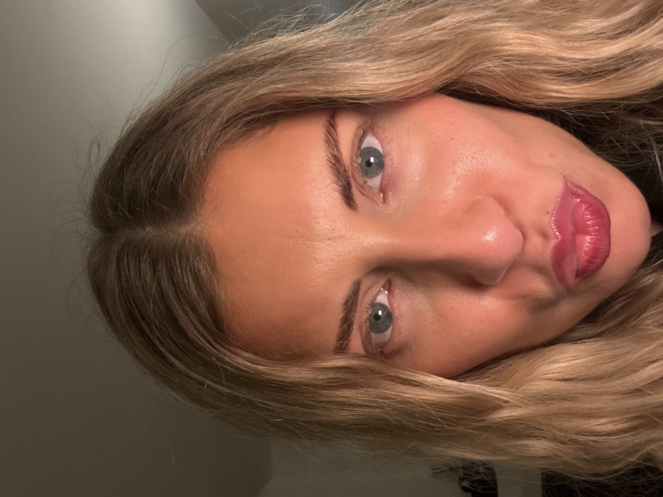 A woman's face dominates the image, tilted to the side, showcasing a close-up view. Her skin appears smooth with a visible glow. Her eyes are pale and framed by defined eyebrows. Her lips are full and coated in a glossy, vibrant color. Blonde hair surrounds her face, creating a soft frame. A neutral background is visible in the corner. The lighting is subtle, emphasizing the features of the face.