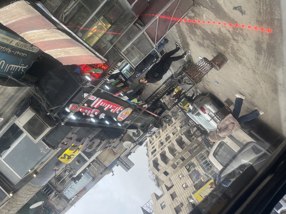 An urban scene shows a street with buildings, parked cars, and pedestrians. The image is taken from inside a vehicle, evident by the dashboard at the bottom. Bright red lights are noticeable overhead. Signage on a building features the text "بورفين يوسف الجاسر" and "Cafe", along with phone numbers "0932261779". The image is rotated.