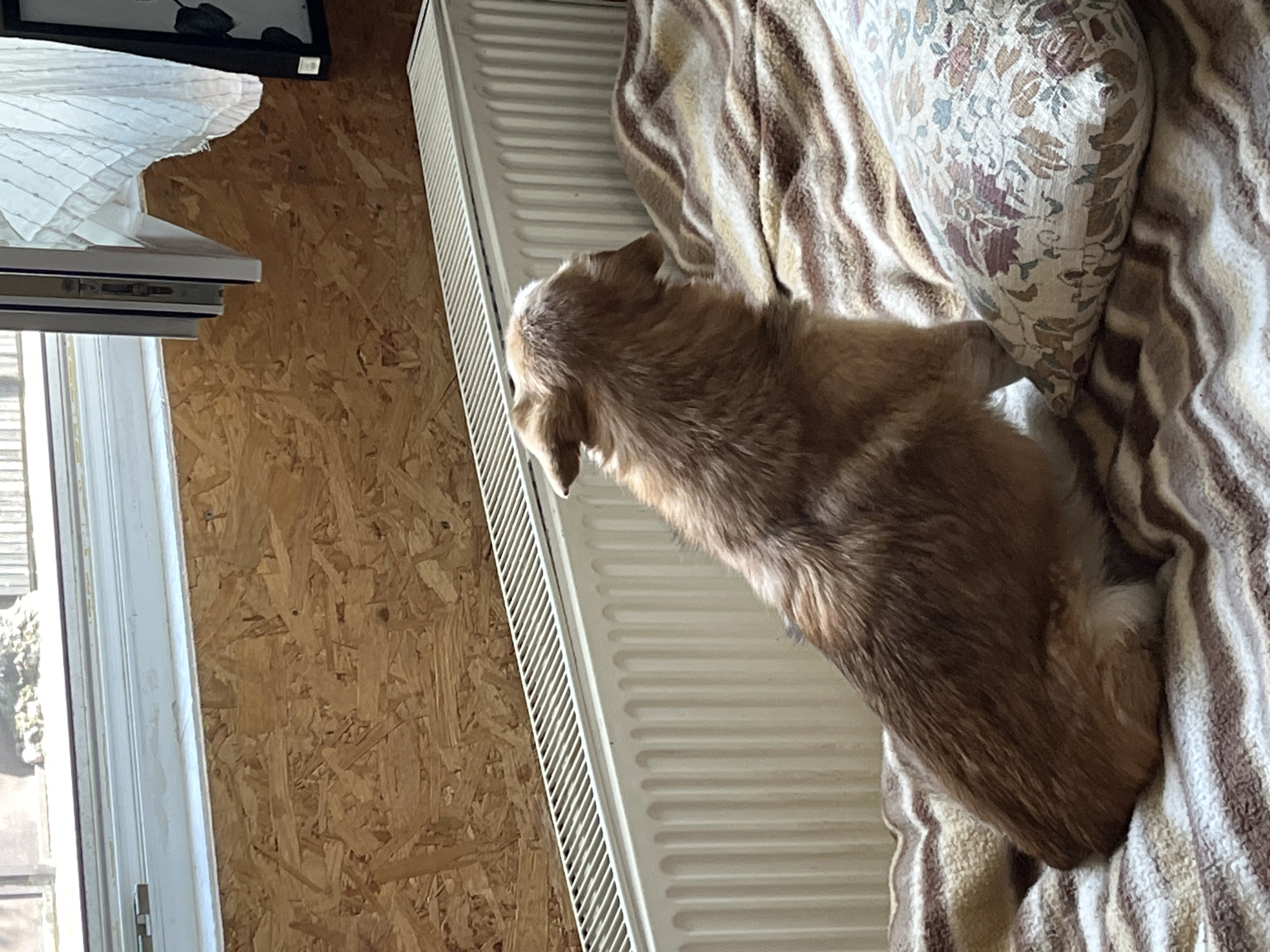 An interior scene depicts a light brown, medium-sized dog with long fur, facing away from the viewer and sitting upright on a bed. The dog's ears are perked, and its head is turned towards a white-framed window, appearing to look outside. The bed is covered with a striped blanket featuring wavy patterns in shades of brown, beige, and white. To the right of the dog, on the blanket, rests a rectangular pillow with a floral pattern in muted red, blue-green, and beige tones. Below the window, a white, finned heating radiator is mounted against the wall. The wall beneath the window and radiator is paneled with oriented strand board (OSB). The window, which has a white frame, is slightly ajar on its right side, with one vertical sash angled inward. A sheer, white curtain with faint vertical stripes hangs from the upper right, partially obscuring a dark-framed object or picture on the wall. Through the window, an indistinct exterior view is visible, showing light and possibly some ground or vegetation. The precise location within the City of Zagreb, Croatia, cannot be determined from the image content.