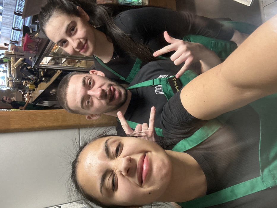 This image depicts an indoor scene within a commercial coffee establishment, identified as a Starbucks, located in Plovdiv, Bulgaria. Four individuals, presumed employees, are visible. In the immediate foreground, a female with dark hair, wearing a black ribbed short-sleeved top and a green Starbucks apron, is positioned on the left. Her face is close to the camera, with eyes narrowed and lips slightly pouted, indicating a deliberate facial expression. Her right forearm is visible in the lower right quadrant of the frame, extending towards the camera. Positioned behind and to the right of the first individual is a male with short dark hair and facial stubble, wearing a black t-shirt with "NEW YORK" text and a green Starbucks apron. He has his tongue protruding slightly and both hands raised, forming a gesture with the index and pinky fingers extended while other fingers are curled. To the right of the male, a second female with long dark hair pulled back, wearing a black long-sleeved top and a green Starbucks apron, is visible. She is looking towards the camera with a subtle upward curve at the corners of her mouth. A thin necklace is visible around her neck. In the background, behind the primary subjects, a long service counter with various coffee-making equipment, dispensers, and a refrigerated display case containing food items is visible. A fourth female employee, also in a green apron, is partially visible in the distant background on the left side of the counter, appearing to be engaged in work. Further into the background on the right, dark upholstered booth seating, indicative of a customer area, is present. Wooden architectural elements are also visible throughout the background. The overall lighting is bright and consistent with an indoor commercial setting.