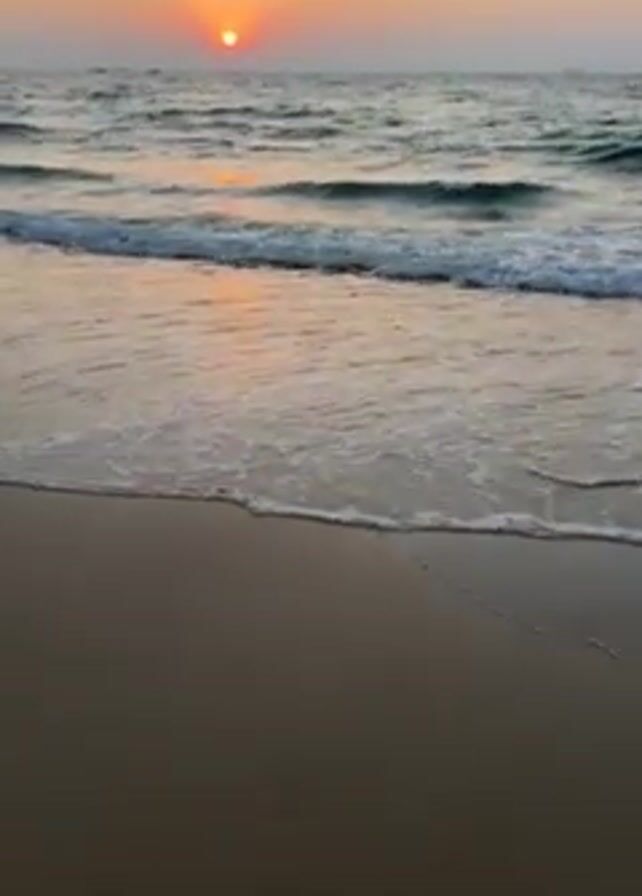 The video depicts a tranquil sunset scene at a beach. The sun, a bright orange sphere, hangs low on the horizon, casting a warm glow across the sky. Gentle waves roll onto the sandy shore, their foamy edges creating a contrasting white line against the darker sand. The beach is empty, with no people visible in the frame. The water reflects the sunset's colors, enhancing the overall serene and peaceful atmosphere.