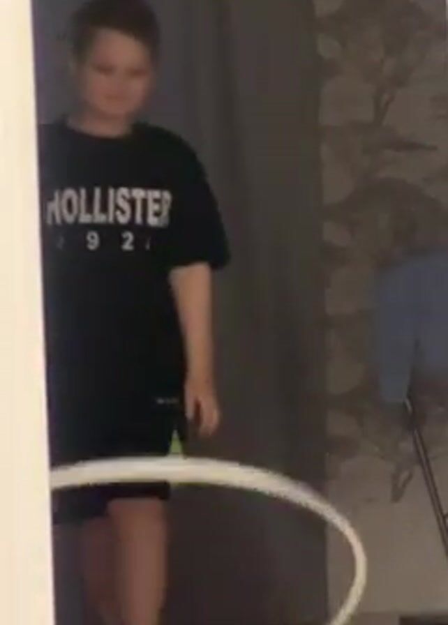A young boy wearing a black Hollister T-shirt, black shorts, and blue socks stands in a doorway. He is holding a white hula hoop and attempts to spin it around his waist. He spins it once, drops it, picks it up again, and holds it. The doorway is framed by a white wall on the left and a grey curtain and patterned wallpaper on the right.