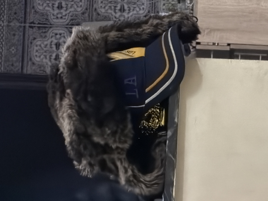 A dark, possibly faux fur hat sits atop a blue baseball cap labeled "LA" in gray lettering with a yellow and white trimmed brim. The hat appears to be resting on a shelf or ledge, with a glimpse of metallic gold wrapping paper or foil peeking out below it. The background includes a patterned wall to the left and a plain, light-colored wall to the right.