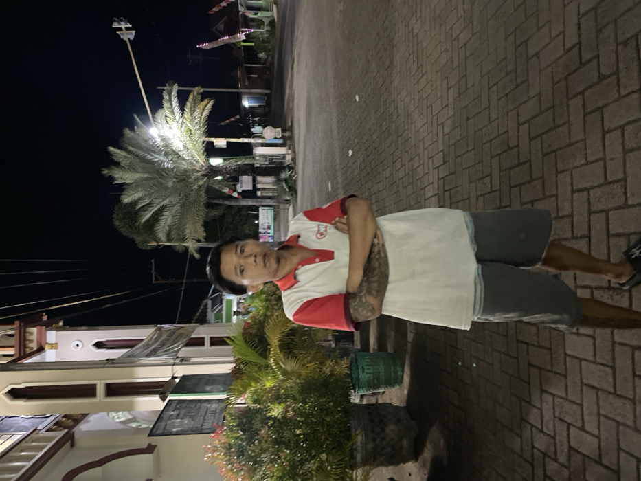 A male subject stands centered on a patterned brick pavement at night in Margoyoso, Indonesia