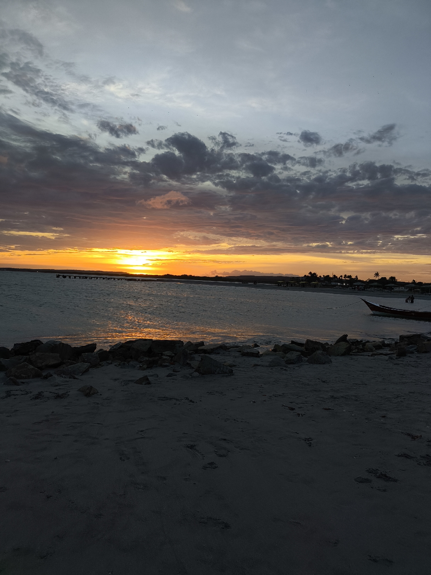 The image depicts a sunset over the water in El Yaque, Venezuela. The sky is filled with a mix of grey and dark clouds. A bright orange sun is setting on the horizon. In the foreground, there is a dark sandy beach with rocks. A boat is partially visible on the right side of the water. In the distance, a pier or structure is silhouetted against the setting sun.