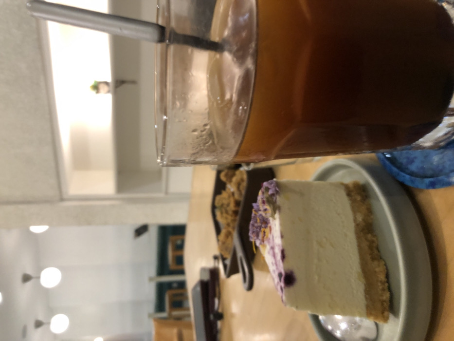 The scene depicts a close-up view of a dining table within a cafe in Semarang, Indonesia. In the immediate foreground, a clear glass tumbler filled with a dark iced beverage, containing ice cubes and a silver spoon, rests on a blue patterned coaster. Adjacent to it, a slice of cheesecake, featuring a graham cracker crust and a white cream layer, is presented on a light green ceramic plate with a silver spoon. The cheesecake is garnished with small purple and yellow floral elements. Behind these items, a dark, cast-iron-style pan contains an arrangement of irregular brown fried food, topped with green flakes, positioned on a light brown wooden table. Further back on the table, a dark electronic device housed in a reddish-brown case is visible. The blurred background reveals a modern cafe interior characterized by white walls, multiple spherical overhead light fixtures, and a white shelving unit displaying a small potted plant on its upper shelf. Additional blurred wooden and green upholstered furniture suggests other seating areas within the establishment.