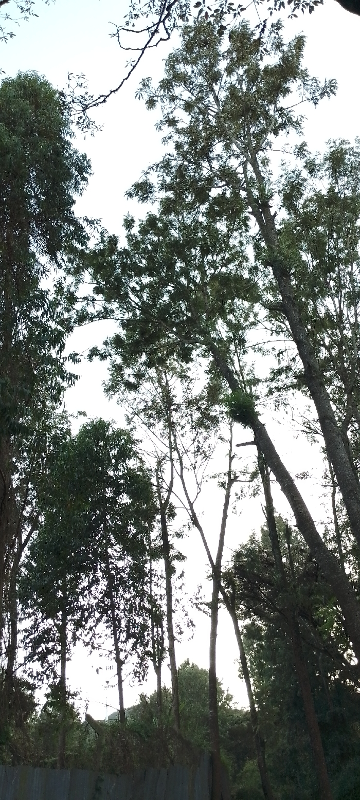 The image showcases a cluster of tall trees reaching towards a pale, overcast sky. Their trunks are slender and upright, some leaning slightly, and their branches are filled with dense green foliage. A concrete wall or structure is partially visible at the bottom of the frame, suggesting an urban or developed setting near a wooded area. The composition emphasizes the height and density of the trees, creating a sense of enclosure and natural beauty.