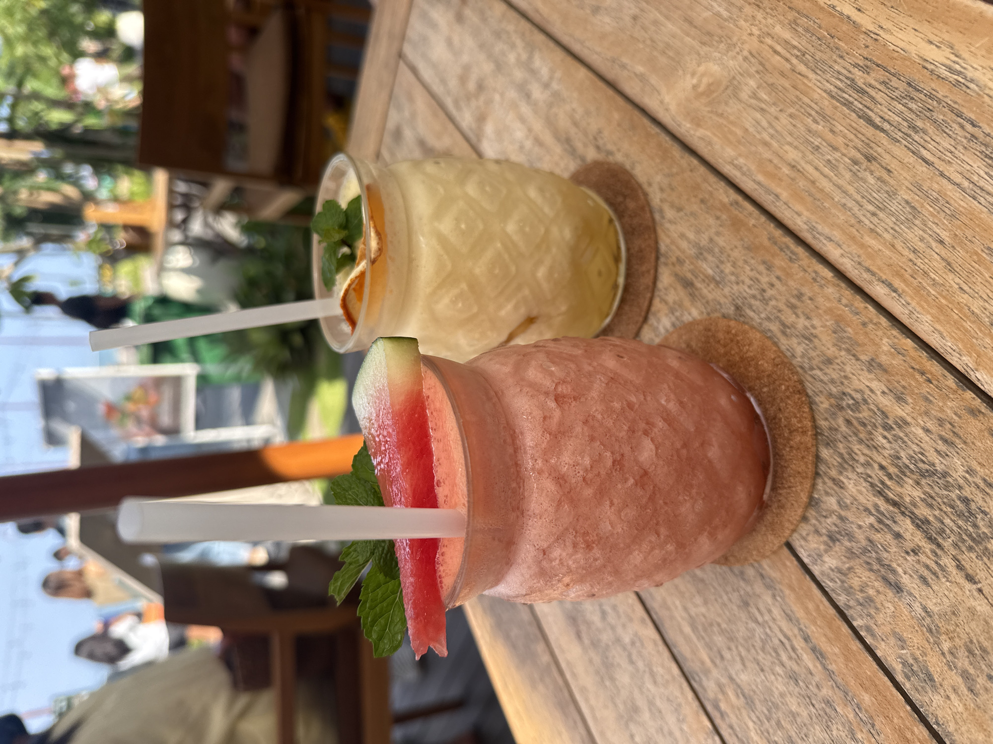 Two frosted beverages in pineapple-textured clear glass tumblers rest on a light-colored wooden plank table in an outdoor setting in Denpasar, Indonesia. The glass on the left contains a reddish-pink, frothy drink, garnished with a triangular slice of watermelon and green mint leaves, with a white straw inserted. It sits on a round, brown coaster. The glass on the right holds a pale yellow, frothy drink, garnished with thin, dried orange slices and green mint leaves, also with a white straw inserted and positioned on a similar brown coaster. In the blurred background, multiple indistinct figures are visible, some standing and others seated at additional wooden tables and chairs. Green foliage and trees are present, and a bright sky with a subtle blue horizon suggests a beachside cafe or restaurant environment.