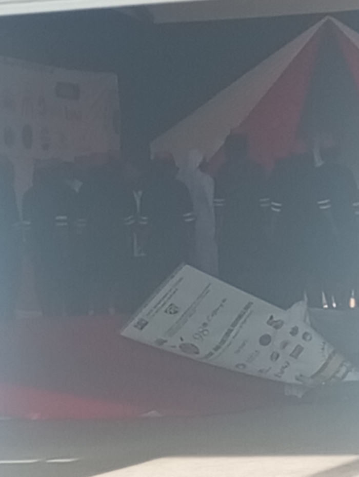 The image captures a daytime outdoor event in Eldoret, Kenya. Approximately ten individuals are positioned on a raised platform, with most wearing dark uniforms featuring two horizontal light-colored stripes on their upper sleeves. One person among them wears a light-colored, full-body garment. A large white banner with text and graphics is visible behind the group on the left, while a large tent with alternating white and red triangular sections forms part of the background on the right. In the foreground, a white poster-board is angled diagonally from the lower left, displaying text that clearly identifies "98th ELDORET AGRICULTURAL SHOW" and "2023," along with multiple corporate logos. This poster rests on a red fabric surface, with a lighter-colored ground visible in the immediate foreground. An overhead light-colored structure partially covers the scene.