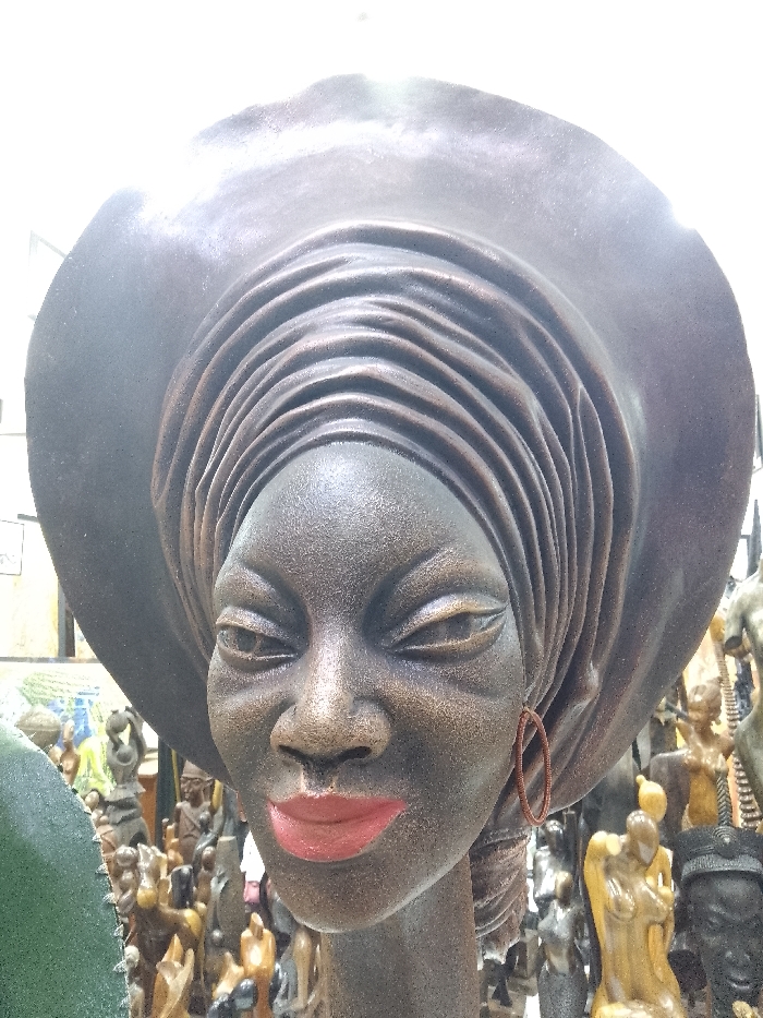 The image displays a close-up, front-facing view of a bust sculpture depicting an African woman, located in Ikate, Nigeria