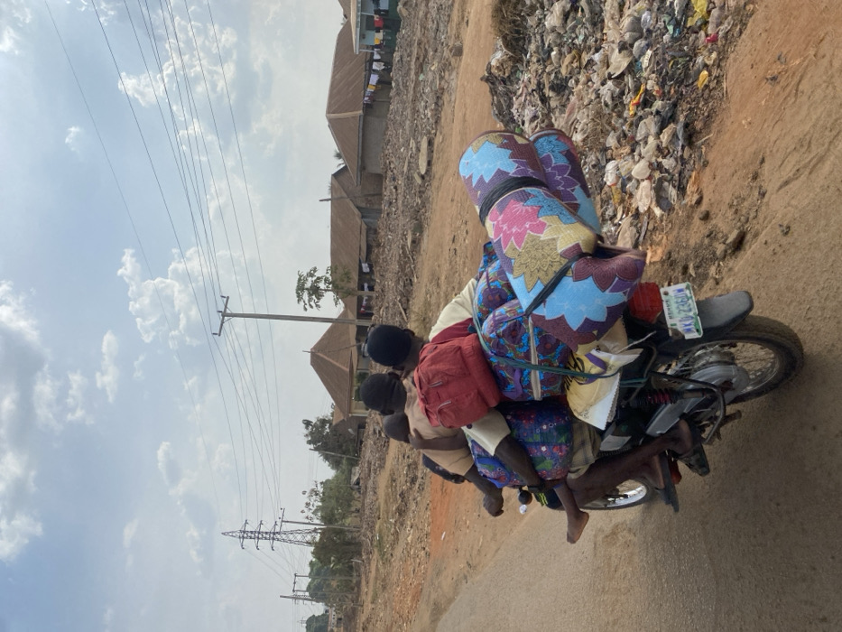 An image captured in Markurdi, Nigeria, depicts a motorcycle on an unpaved, reddish-brown dirt road with a section of asphalt visible in the immediate foreground. The motorcycle, a silver-colored commuter model with Nigeria license plate KDU 236GU, is shown from the rear, traveling away from the viewer. It carries at least four individuals: a driver, a small child positioned immediately behind the driver (identifiable by bare legs), a male passenger wearing a light-colored shirt and a red backpack behind the child, and another passenger behind the individual with the backpack. All occupants are seated in close proximity. The motorcycle is heavily laden with cargo. Multiple rolled, colorful patterned sleeping mats are strapped horizontally to the rear. Additionally, several patterned fabric bags, including one large blue-green bag, are secured to the sides and rear of the motorcycle, enveloping the passengers. To the right of the road, a substantial accumulation of domestic waste, including plastic bags and assorted debris, forms a roadside dump. In the background, several single-story residential structures are visible. These buildings feature varied roof types, including corrugated metal and some with distinctive conical or pyramidal shapes. Laundry is visible hanging to dry outside one of the houses on the right. The left side of the scene features a large metal high-tension electricity pylon and several wooden utility poles supporting overhead power lines. The sky is partly cloudy with scattered white cumulus clouds. The lighting indicates daytime conditions.