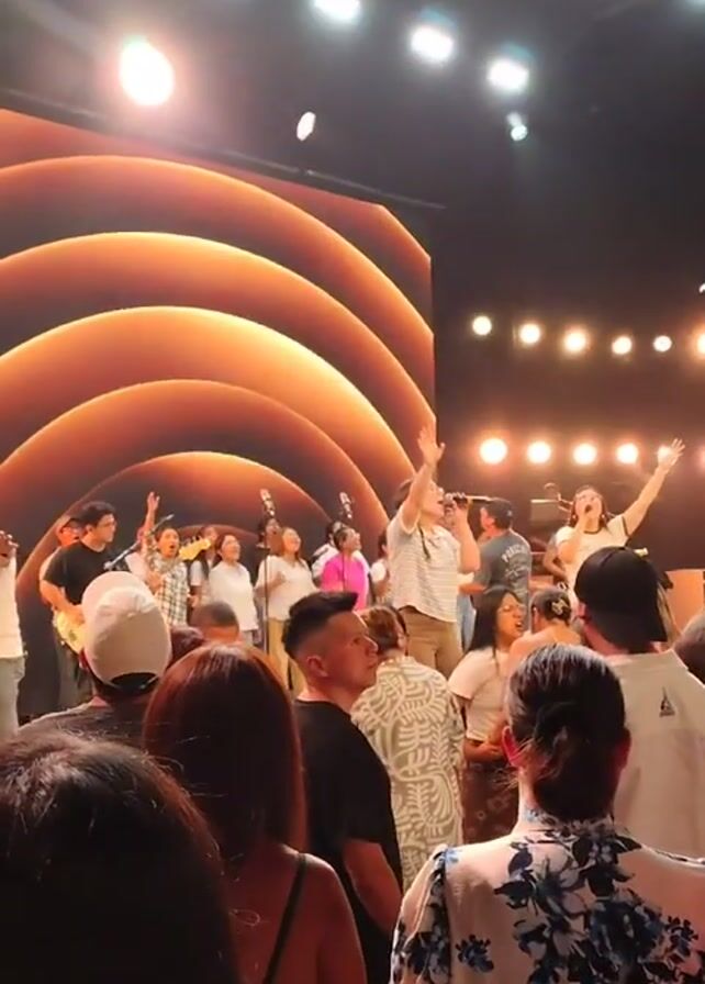 crowd of people gathered in a dimly lit indoor venue with a stage. Most of them face forward towards the stage, where several people, likely performers, stand with their arms raised in the air. The stage is equipped with bright spotlights and features a large screen displaying concentric golden waves. The audience consists of men and women of varying ages and ethnicities, dressed casually. The atmosphere appears celebratory, possibly a concert or a religious gathering.