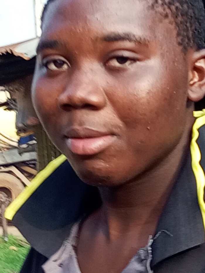 A young dark-skinned person stares directly at the camera. They wear a dark collared shirt with a yellow stripe along the collar. The background is somewhat blurred, showing glimpses of foliage, a structure with corrugated metal, and other indistinct objects. The lighting is bright, reflecting off the person's skin, particularly on their forehead and cheeks. The person has short hair and a serious expression.