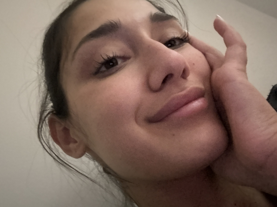 A woman with dark hair pulled back from her face rests her cheek on her hand. She has dark eyes and full lips, and a slight smile plays across her face. Her eyebrows are thick and well-defined, and her eyelashes are long. The light is soft, highlighting the contours of her face. The background is a plain, light-colored wall.