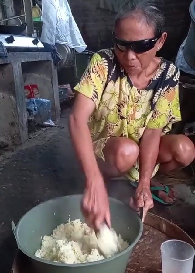 An elderly Asian woman wearing dark sunglasses, a yellow and green floral shirt, and green sandals is squatting in what appears to be a kitchen. She is mixing a large bowl of steaming white rice with a utensil. The bowl sits on a woven tray. A clear plastic cup is next to the bowl. The kitchen is somewhat cluttered with a small metal table in the background, a tarp hanging in the corner, and various buckets and containers around. The overall lighting of the room is dim. The woman is focused on the rice in the bowl. She is talking as she mixes.