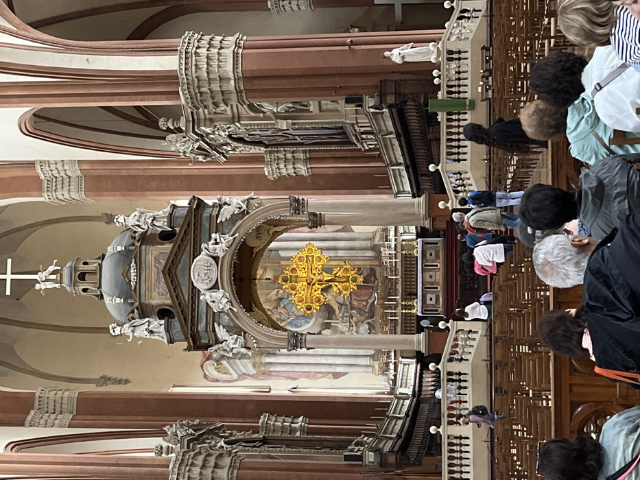 This image depicts the interior of the Basilica of San Petronio in Bologna, Italy, specifically looking towards the high altar and nave. The scene focuses on the ornate high altar area, which is elevated and accessed by a set of white balustraded stairs on either side. Above the white altar table, a large, intricately carved wooden baldachin or ciborium rises, featuring columns, an arched canopy, and a domed top surmounted by a white cross and small sculptural figures. Beneath this baldachin, a large, prominent golden crucifix, adorned with a central figure of Christ and smaller decorative roundels, hangs. Behind the crucifix, a large painted altarpiece or mural depicts religious figures. The basilica's architecture is characterized by towering reddish-brown columns with white capitals and intricate moldings, supporting arched ceilings and upper galleries. To the right of the altar, a large, dark wooden structure, possibly an organ case or choir stalls, is visible with additional white statues and carvings. A solitary white statue of a robed figure stands at the base of the right staircase leading to the altar. In the midground, numerous rows of empty wooden pews or chairs face the altar, extending towards the foreground. A group of approximately 15-20 individuals, appearing to be tourists or visitors, are gathered at the base of the left staircase, facing the altar and observing the structure. Other individuals are scattered in the midground and immediate foreground, with the backs of several heads visible in the bottom portion of the image, also facing the altar. Actions observed include standing, walking, and collective observation of the altar area. No distinct individual interactions are clearly discernible. The environment is well-lit, highlighting the golden elements of the crucifix and the architectural details.