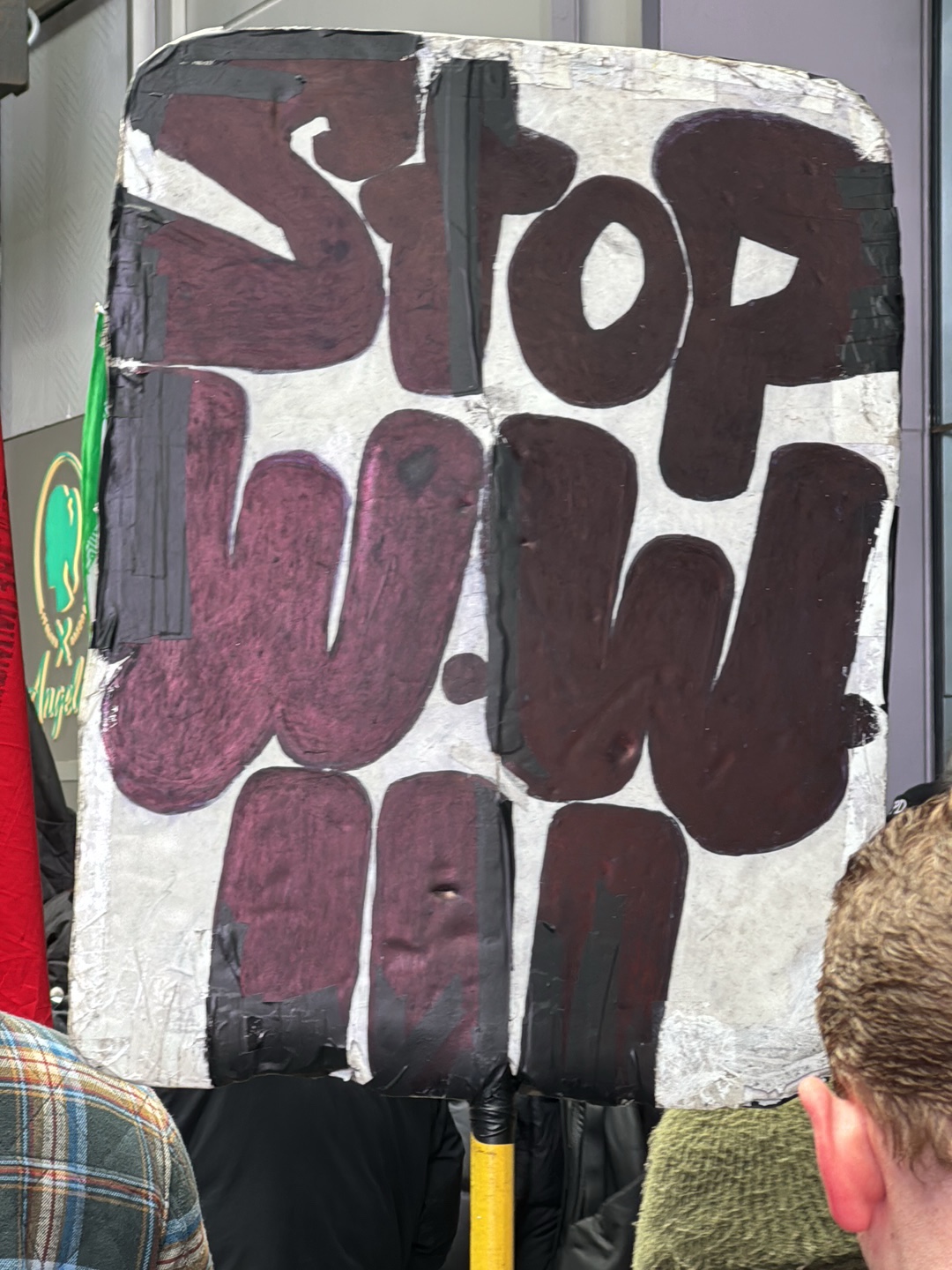 A handmade protest sign is prominently featured, displaying the phrase "STOP W