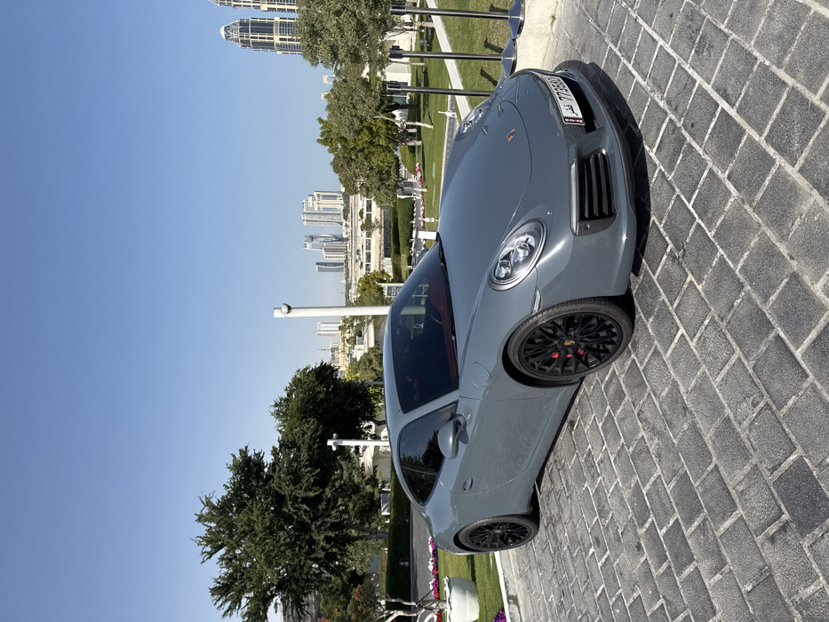A gray Porsche 911 Coupe is parked on dark gray rectangular paver stones arranged in a basket-weave pattern. The vehicle displays a Qatar license plate, number 773580, and features black multi-spoke wheels with red brake calipers. Its interior appears to be red. The scene is outdoors under a clear blue sky, illuminated by daylight. To the left of the vehicle, a manicured green lawn with various trees, bushes, and white planters containing colorful flowers is visible. In the immediate background, white architectural elements, possibly light poles, are present amidst further landscaping. The distant background reveals a modern urban skyline consisting of multiple high-rise buildings, including distinctive twin cylindrical towers on the far right. This architectural context and the license plate identify the location as the city of Doha, Qatar, specifically consistent with areas such as The Pearl-Qatar. No individuals are depicted in the scene.