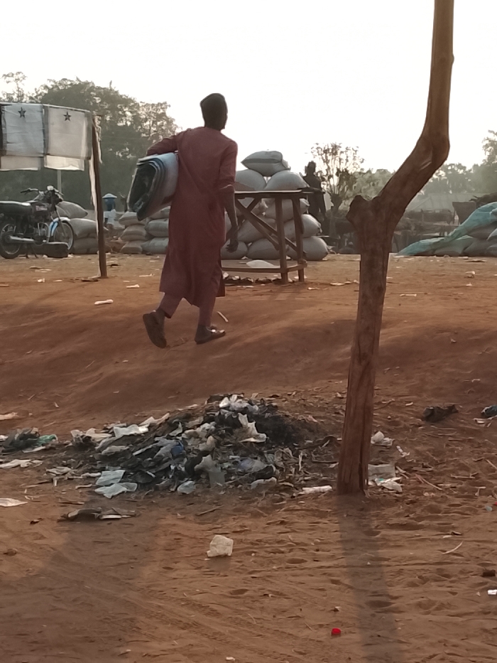 A man in a maroon robe walks across a red dirt ground carrying rolled material on his shoulder. In the background, there are stacks of sacks on pallets, a motorcycle, and a structure with white flags with stars. A small, leafless tree stands to the right, with a pile of trash near its base in the foreground. The sky is overcast, giving a hazy light to the scene.