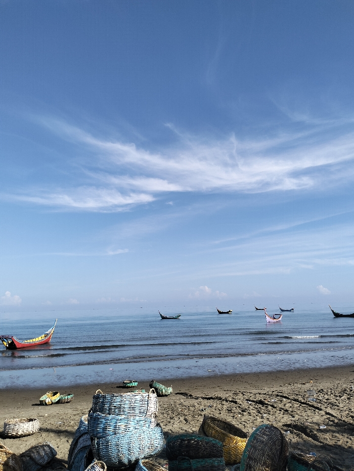 A coastal scene unfolds with several boats dotting the calm ocean under a blue sky with wispy clouds. The foreground reveals a sandy beach scattered with an array of woven baskets, their colors ranging from blue to yellow. A red and yellow boat rests near the shore, while other smaller, darker boats are visible further out on the water. The tranquil scene evokes a sense of peace and the everyday life of a fishing community.