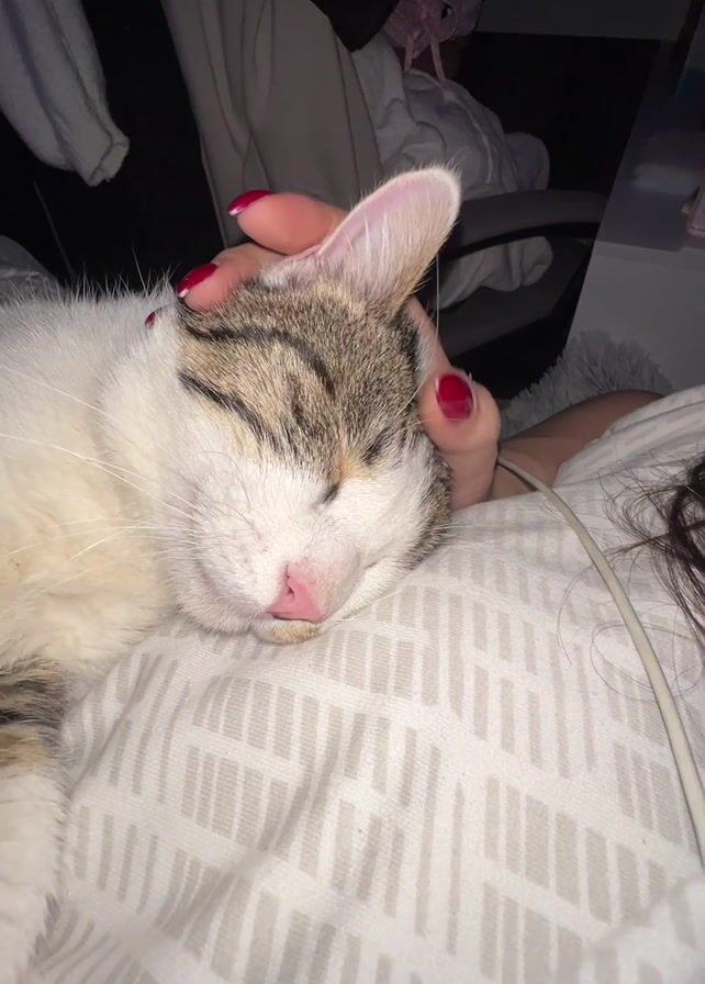 A person is petting a sleeping cat on a bed. The cat is white with gray tabby markings and is lying on its side on a gray and white patterned comforter. The person's hand, with red nail polish, is resting on the cat's head. The background shows a dimly lit bedroom with a mirror, a desk, and some hanging decorations. The lighting is soft and indirect.