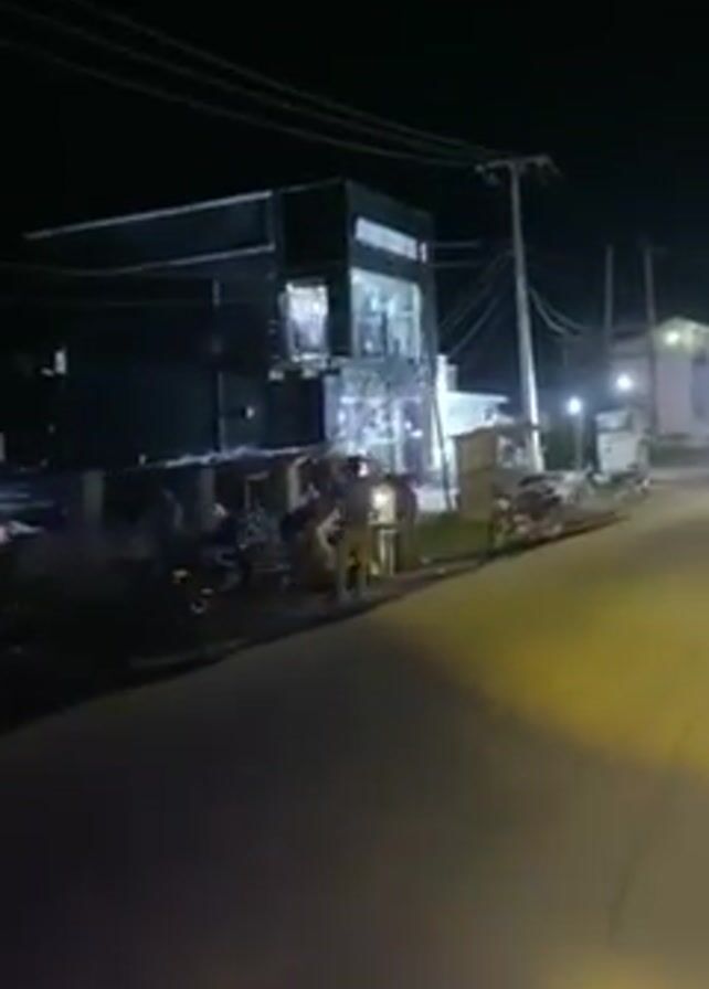 At night, a slow pan across the street reveals a two-story building labeled "OPPOSER TRENDY WEARS." The building is dark, with the windows on both floors illuminated, showing mannequins and clothing. A few people are standing near motorcycles parked at the edge of the road near the building. Cars pass on the road, their headlights clearly visible. The environment is urban, as evidenced by the utility poles and streetlights along the road.