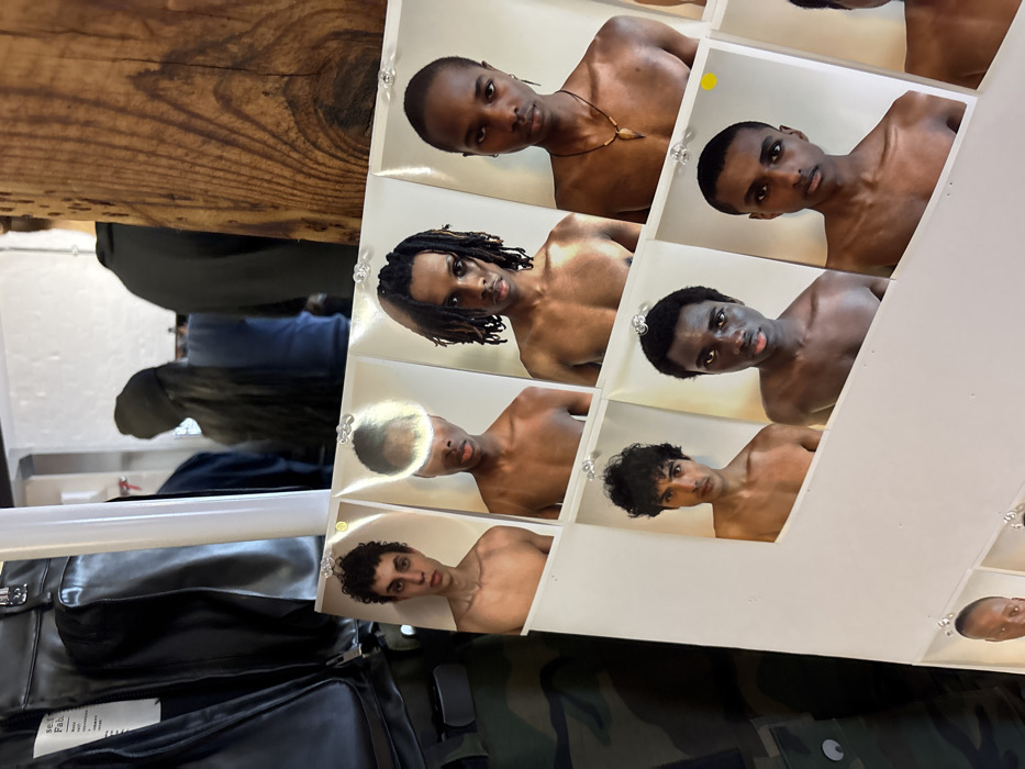 The image captures an indoor scene in a commercial or creative workspace, characteristic of London's fashion or design districts. In the foreground, a white display board, angled towards the viewer, showcases nine portrait photographs of shirtless young men. Each photo, secured by clear pushpins, features a distinct individual from the chest up, exhibiting various skin tones, hairstyles (including curly, dreadlocks, and short cuts), and minimal accessories such as earrings or a pendant necklace. A prominent circular light reflection obscures part of one subject's head in the upper row, and small yellow circular stickers are present on several photos. To the immediate left, a dark, reflective garment, possibly leather, hangs vertically, bearing a white tag with text including "self fabrication," "Fabric," and "Made in." Below this garment, a section of green and brown camouflage-patterned fabric is visible. To the right, a vertical wooden beam with a visible grain pattern forms part of the room's interior structure. The background features blurred figures, including one person seen from behind with long dark hair, wearing a dark beanie and a blue shirt, indicating the presence of other individuals in the space. The setting suggests a studio, showroom, or casting environment within the city of London, United Kingdom.