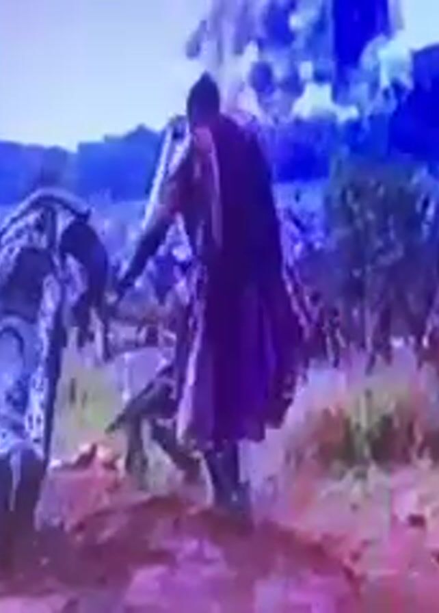 A man in a neon orange shirt stands in a room with a blue and purple aesthetic. He seems to be holding a sword. The scene then transitions to a chaotic fight scene with multiple people in dark clothing and armor. Bright blue and purple light effects surround the combatants. The action is fast-paced and dynamic, with obscured figures engaging in what appears to be a fierce battle.