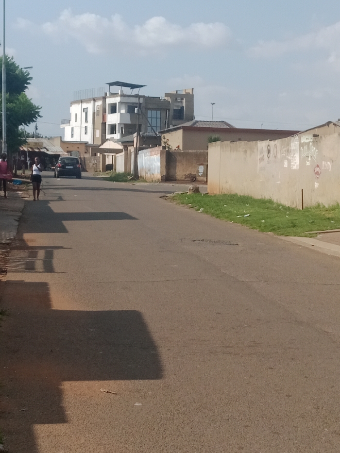 A street scene depicts a narrow asphalt road stretching into the distance, flanked by buildings and walls. On the left, figures walk near trees, and a black car is visible. The right side features a high concrete wall with patches of grass growing along the base. The background shows a multi-story building under a partly cloudy sky. Shadows are cast across the road, indicating strong sunlight. Debris is scattered along the roadside.