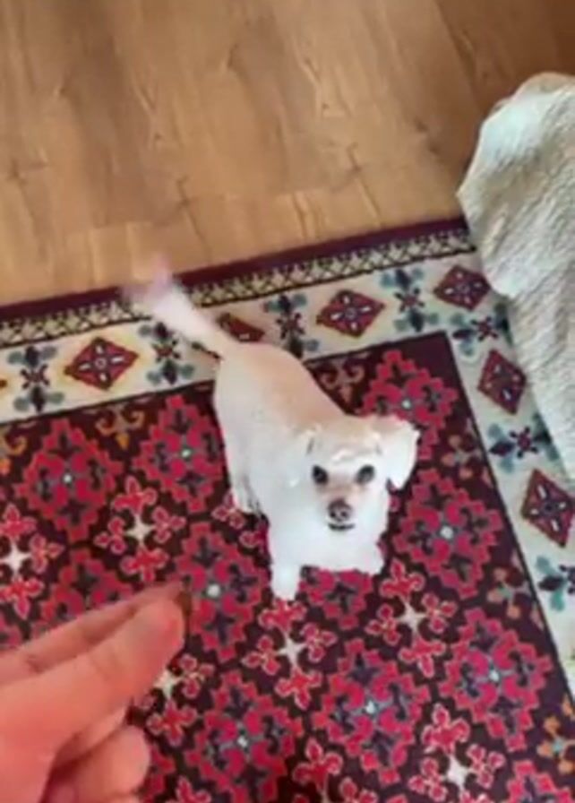 A hand is holding a brown dog treat above a small, white dog, which is standing on a patterned rug