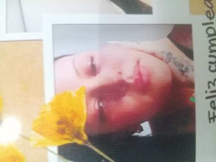 A close-up image captures a person's face in a framed photograph. A yellow flower is positioned in the lower left corner, partially obscuring the person's face. The person has fair skin, pink lips, and appears to have a tattoo on their upper shoulder/neck area. Text is visible on the right edge of the frame that reads "Feliz cumple". The image is slightly blurred.