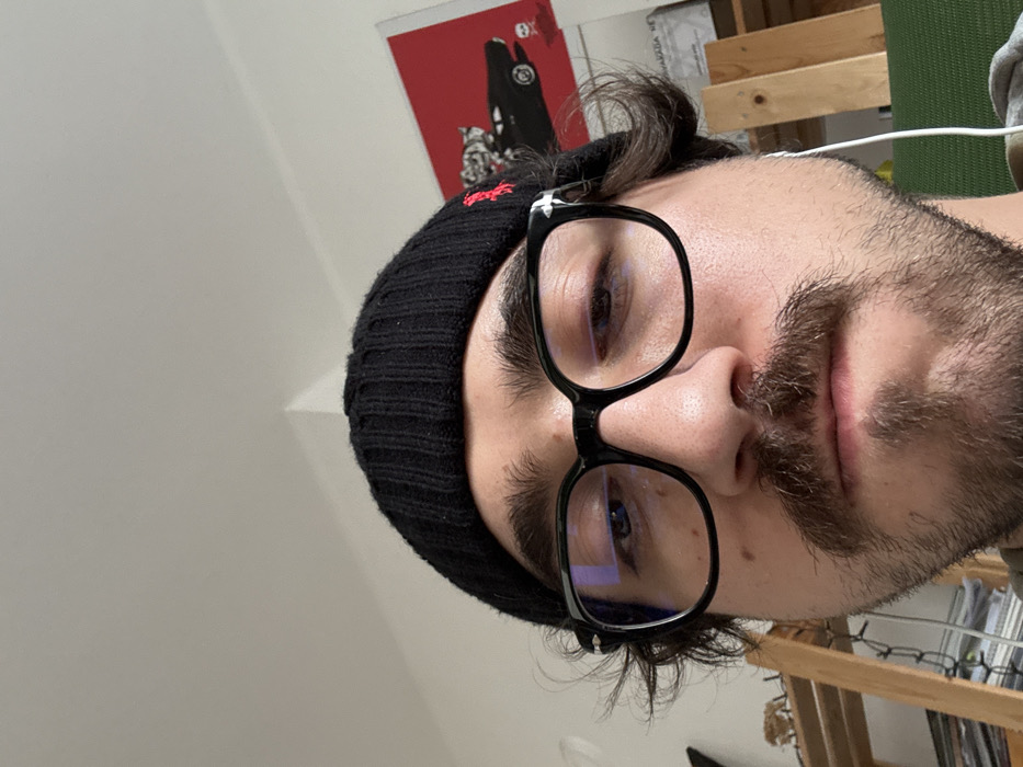 An indoor, upward-angled shot captures an adult male in Sofia, Bulgaria, filling the lower two-thirds of the frame. He wears a black ribbed beanie and dark-framed eyeglasses, displaying a neutral expression towards the camera. Dark hair is visible around his ears, and he has a mustache and a goatee. A white earbud is inserted into his right ear. The background consists of a light-colored wall with an interior corner visible in the upper center. To the subject's left, a light wood shelving unit holds a small, decorative animal figurine and stacked papers. Partially visible fairy lights hang vertically. To the subject's right, a red poster is affixed to the wall, depicting a dark classic car with stylized elements, including a skull, against the red background. Another segment of a light wood furniture piece is visible on the far right.