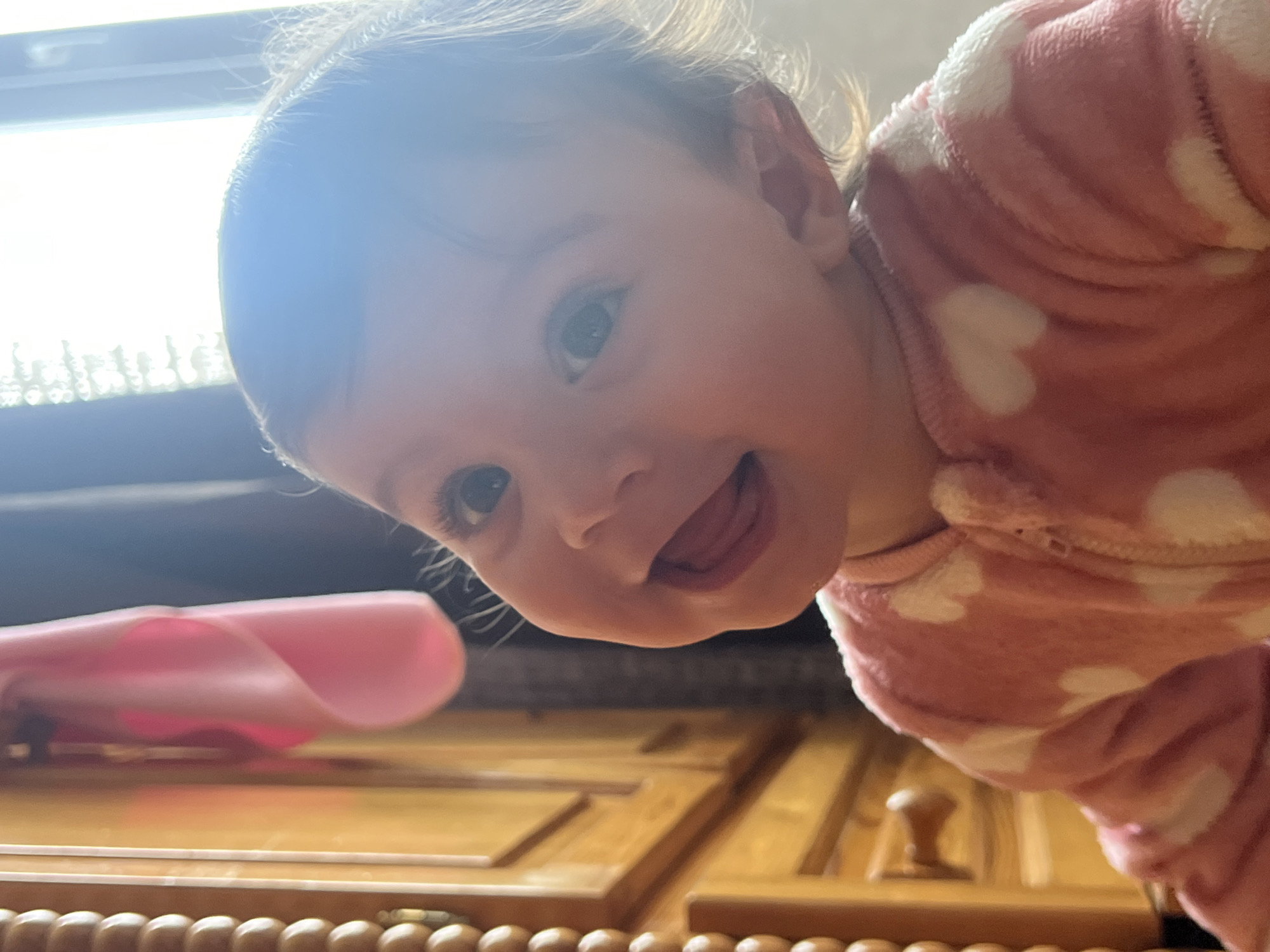 A baby with light skin, dark hair and blue eyes is peering down at the camera. The baby is wearing a pink and white heart-patterned, long-sleeved garment. The baby is smiling with its tongue slightly protruding. Beneath the baby is a wooden surface, possibly a table or cabinet, with a knob on the right side. A pink object, potentially cloth or paper, rests on the wooden surface to the left. Bright light enters from the top left of the frame, near a window or opening, casting a glare. The location is Elena, Bulgaria.
