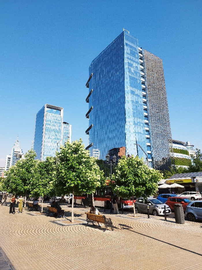 - "A sunny cityscape shows modern glass skyscrapers rising behind a row of lush green trees lining a brick-paved pedestrian area" by FM-ZqBmD2, licensed under CC BY 4.0